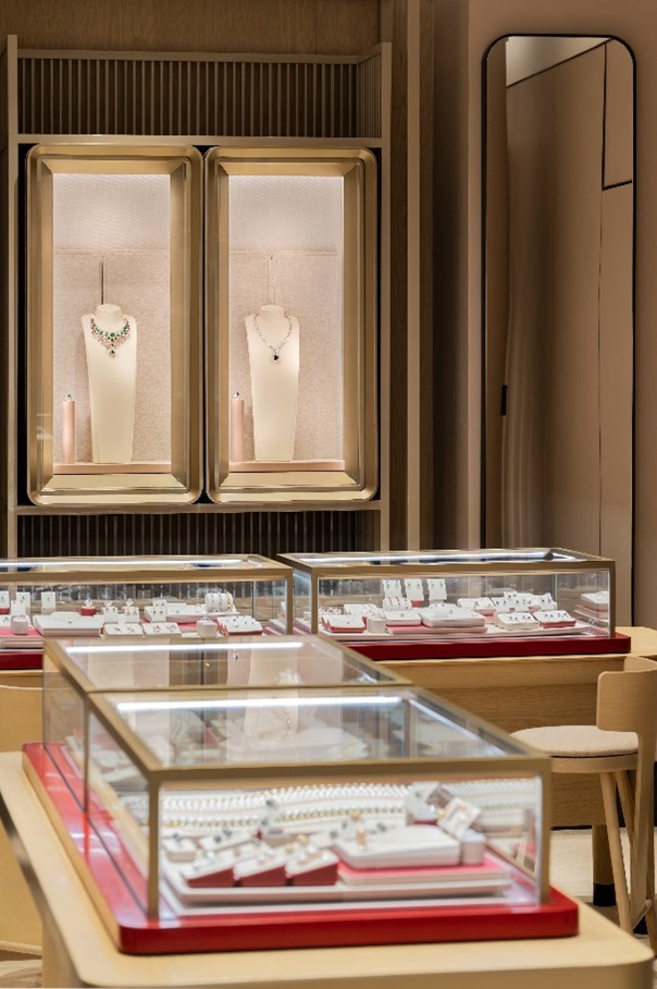 顾客可以在店铺一至四层探索经典时尚珠宝、高级珠宝、黄金工艺杰作等主题场景,各具特色的空间为顾客打造沉浸式、个人化购物体验。店铺五层的品牌体验中心设有CTF for YOU专区,提供珠宝工艺互动展示、私人订制等互动性购物体验,顾客可在此享受个人化订制服务。